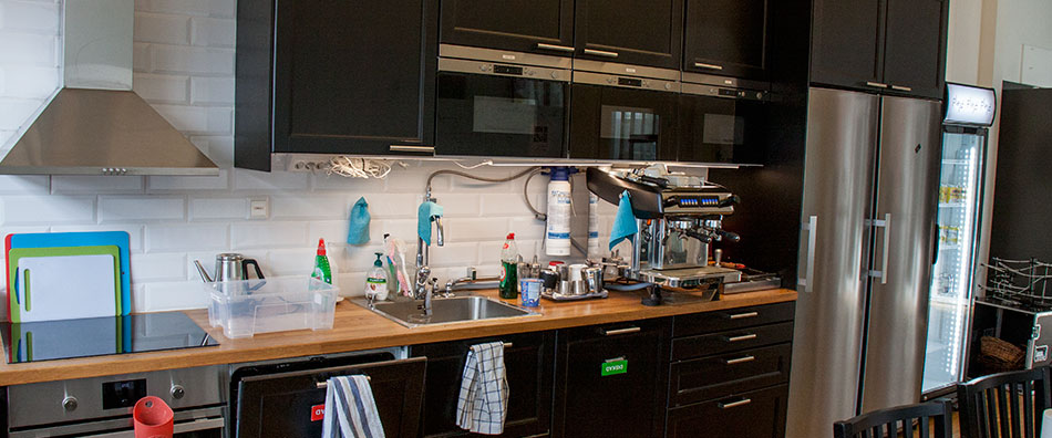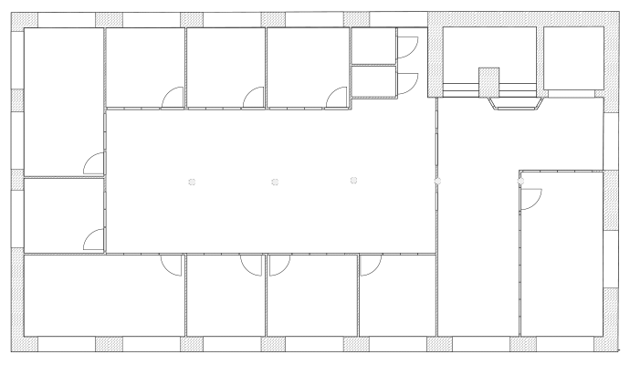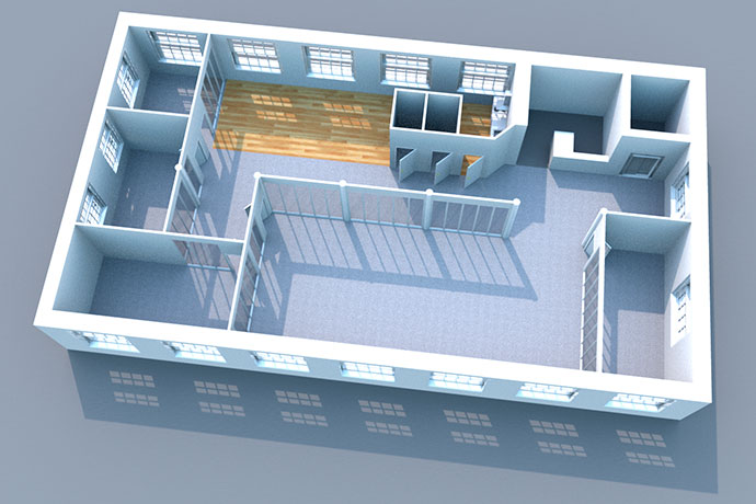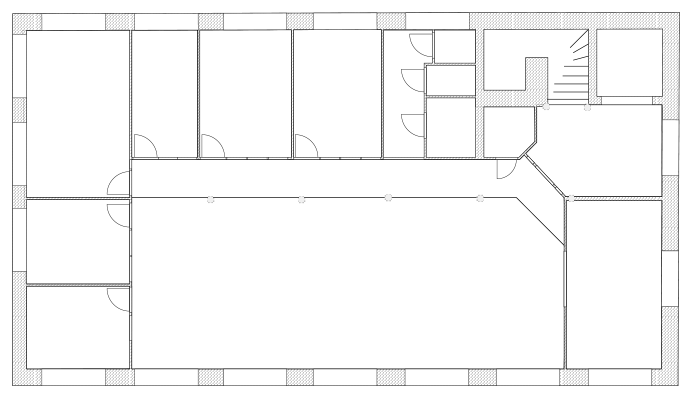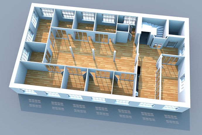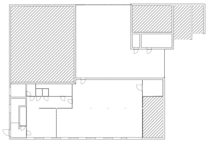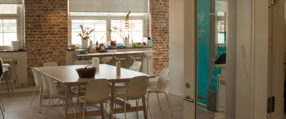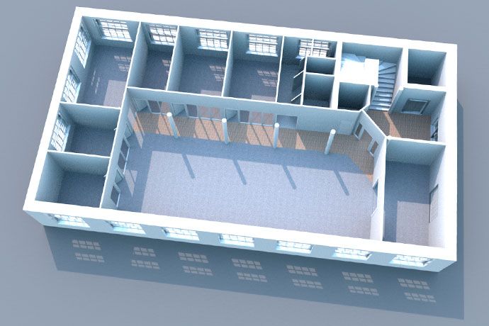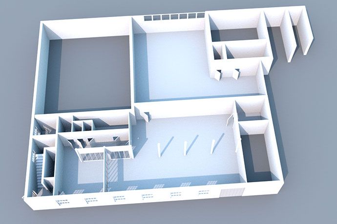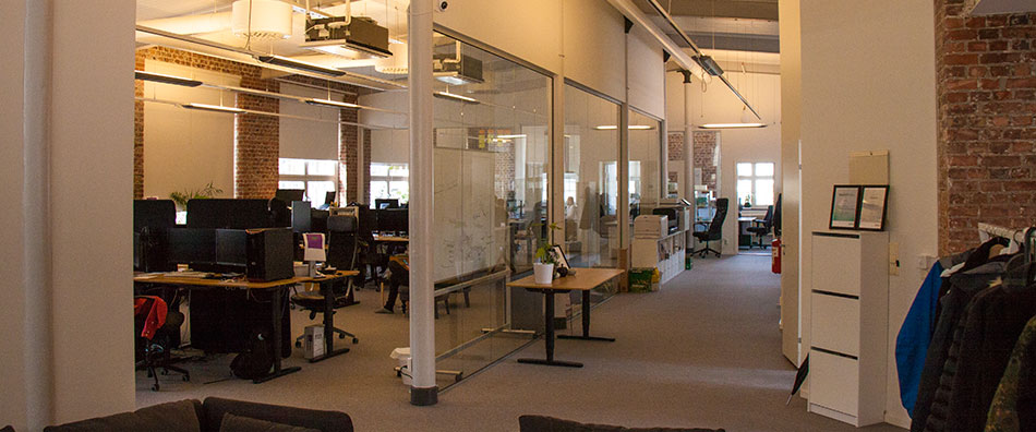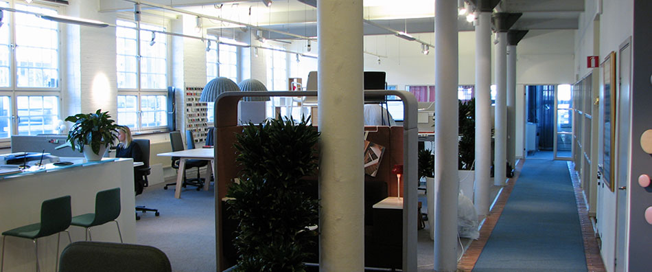 950 m² kontor/utställning i egen byggnad om tre våningar.